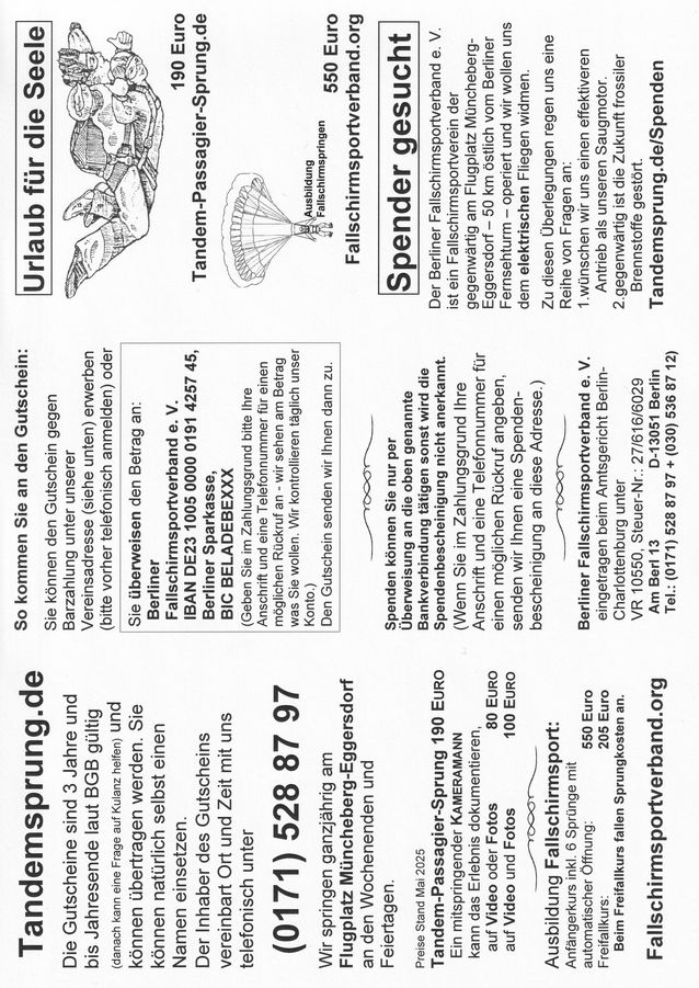 Berliner Fallschirm- sportverband e. V. Tandemspringen und konventionelle Ausbildung im Fallschirmsport im Umland von Berlin am Flugplatz Müncheberg-Eggersdorf im Bundesland Brandenburg. Info-Material download Windows->pdf alles Android->jpg Seite 1 und Seite 2 Vielleicht ahnen Sie etwas von der Schönheit der Entspannung, welche der Anspannung folgt. Preise Spenden Diashow Impressum Datenschutz |